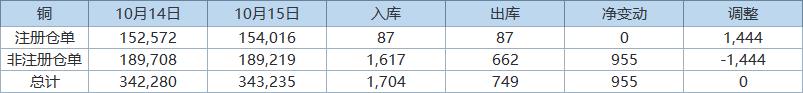 10月15日COMEX铜库存为343,235短吨,入库1,704短吨,出库749短吨,净增加955短吨,未作调整。