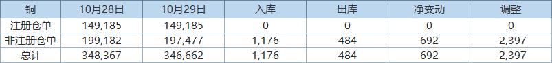 复制链接10月29日COMEX铜库存为346,662短吨,入库1,176短吨,出库484短吨,净增加692短吨,调整-2397短吨。