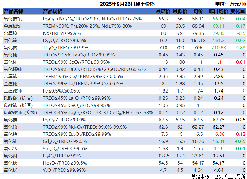今日稀土市场主流产品价格普遍回调。氧化镨钕均价报56.11万元/吨,较昨日下滑0.04万元/吨;金属镨钕均价为68.94万元/吨,下跌0.17万元/吨;氧化镝均价161.18万元/吨,微降0.02万元/吨;氧化铽均价706.00万元/吨,下调4.83万元/吨。今日金属钕、氧化镨、氧化钕、氧化钬等品种成交有限,报价参考需谨慎。