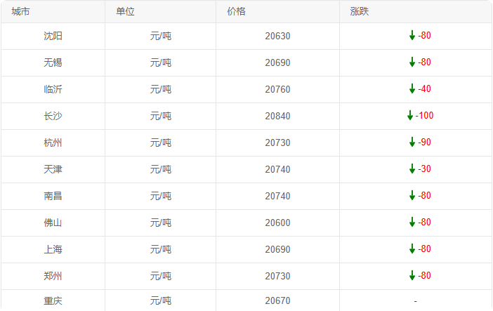 长沙跌幅相对较大,价格20840元/吨、下跌100元/吨;杭州下跌90元/吨至20730元/吨;沈阳、无锡等多城下跌80元/吨;临沂、天津分别下跌40元、30元/吨;重庆价格20670元/吨,当日持平。