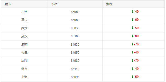 今日下跌呈现“中部/东北跌幅大、沿海/一线跌幅小”的区域特征:武汉(-80元/吨,85100元/吨)、济南(-70元/吨,84930元/吨)、沈阳(-70元/吨,84980元/吨)跌幅靠前;西安(-50元/吨,85030元/吨)、上海(-50元/吨,85095元/吨)跌幅适中;广州(-40元/吨,85080元/吨)、天津(-40元/吨,84950元/吨)、北京(-40元/吨,85110元/吨)跌幅较小。
