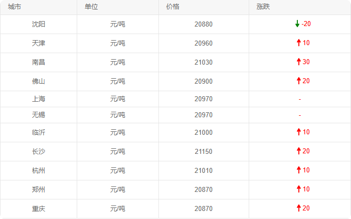 具体价格上,南昌以30元/吨的涨幅领涨,报21030元/吨;佛山、长沙、重庆上涨20元/吨,分别报20900元/吨、21150元/吨、20870元/吨;天津、临沂、杭州、郑州上涨10元/吨,分别报20960元/吨、21000元/吨、21010元/吨、20870元/吨;上海、无锡均报20970元/吨,沈阳报20880元/吨。