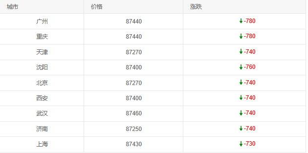 根据中冶有色网10月31日17:23更新的数据,全国10个主要城市电解铜价格均明显下跌,广州、重庆、沈阳、西安、武汉等城市价格在87400-87460元/吨之间,跌幅740-780元/吨;上海、济南价格分别为87430元/吨、87250元/吨,跌幅730-740元/吨;天津、北京价格最低为87270元/吨,跌幅740元/吨,各城市价格差异不足200元/吨,市场走势高度一致,区域供需均衡。