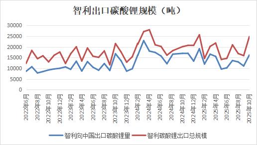 复制链接智利海关公布的数据显示,智利10月锂出口量为27,562吨,其中碳酸锂出口量为24,769吨。当月对中国出口碳酸锂16,210吨,同比下降4%,环比增加46%。下游处于传统需求旺季,叠加储能需求超预期,智利对中国出口碳酸锂显著回升,刷新2025年4月以来高位。
