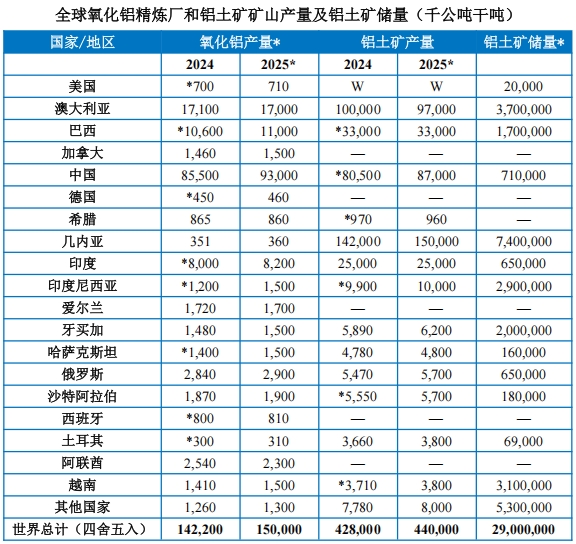 全球铝工业资源与加工分离。根据2024年全球铝土矿与氧化铝产业的统计数据与2025年预测,全球氧化铝产量预计从1.42亿吨增至1.5亿吨,铝土矿产量从4.28亿吨微增至4.4亿吨,已探明总储量约290亿吨。产业地理分工显著,铝土矿资源高度集中于几内亚、澳大利亚和巴西,而氧化铝冶炼则由中国主导,形成了资源国输出原矿、工业国加工生产的全球供应链模式。