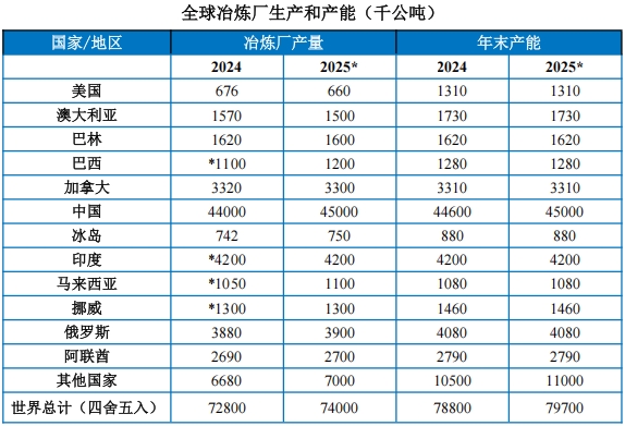 产量增速放缓,产能稳步扩张。根据统计数据,2024年全球原铝产量预计约为7280万吨,到2025年将小幅增长至7400万吨;同期年末产能也从7880万吨提升至7970万吨。这表明全球原铝行业正处在稳步增长但增速有所放缓的阶段,市场对未来需求仍持乐观预期。