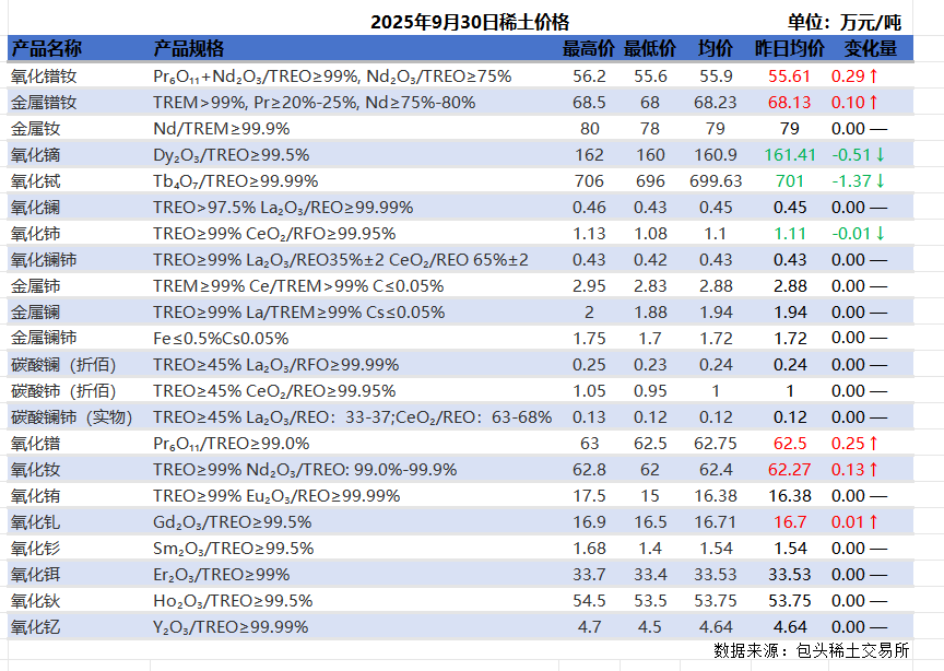 今日稀土市场主流产品价格呈现分化走势。氧化镨钕均价为55.90万元/吨,较前日上调0.29万元/吨;金属镨钕均价报68.23万元/吨,小幅上升0.10万元/吨;而氧化镝均价回落至160.90万元/吨,下跌0.51万元/吨;氧化铽均价为699.63万元/吨,下降1.37万元/吨。